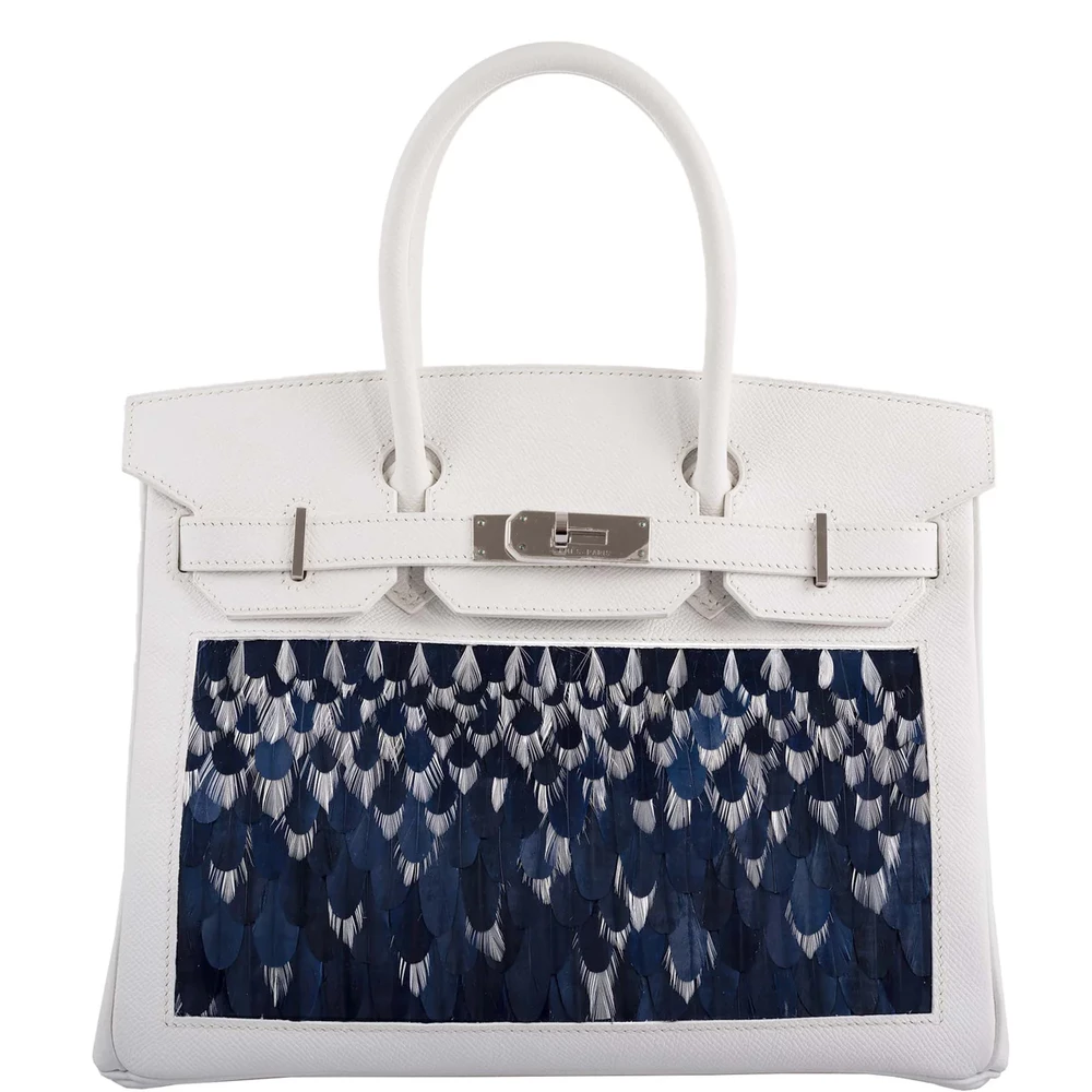This Hermès Birkin 30 replica redefines artistry with pristine White Epsom leather, its feather-panel embroidery evoking ethereal lightness against palladium hardware. Rigorous Sellier stitching frames the structured silhouette, while a tonal clochette and sangles nod to Hermès’ exotic creations. Feather motifs are hand-applied with silk threads, ensuring durability for admirers of intricate luxury replica handbags. Epsom’s scratch-resistant grain and reinforced corners cater to modern minimalists, blending avant-garde design with timeless Sellier craftsmanship. A mirror-quality homage for collectors of high-end dupes and bespoke exotic artistry.