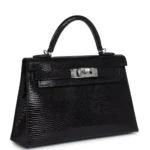 This Hermès Kelly 20 Black Varanus Lizard replica exudes stealth luxury with its jet-black Niloticus scales, polished to a liquid sheen under palladium hardware. Sellier stitching traces the compact silhouette, while a clochette charm nods to clandestine elegance. A AAA-quality marvel for collectors of mirror-like reptilian texture, it balances noir drama with everyday versatility. The lizard skin resists creasing, reinforced by Hermès’ proprietary “rigidissimo” base. A timeless emblem for boardrooms or midnight métro rides.