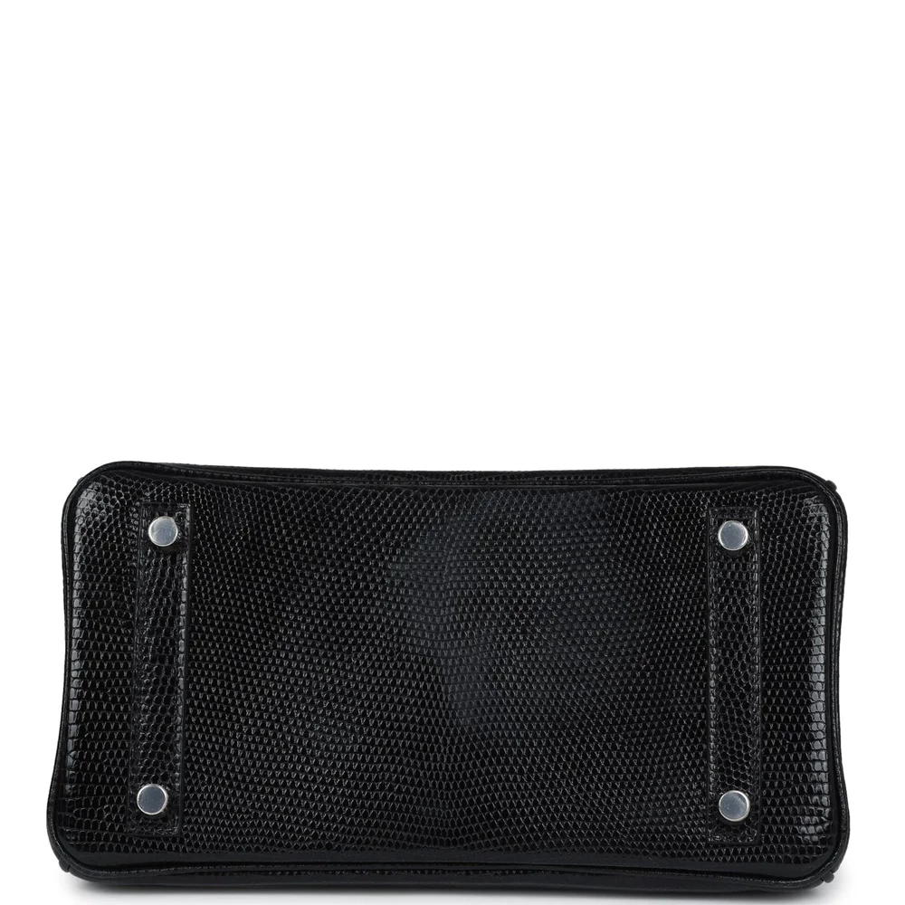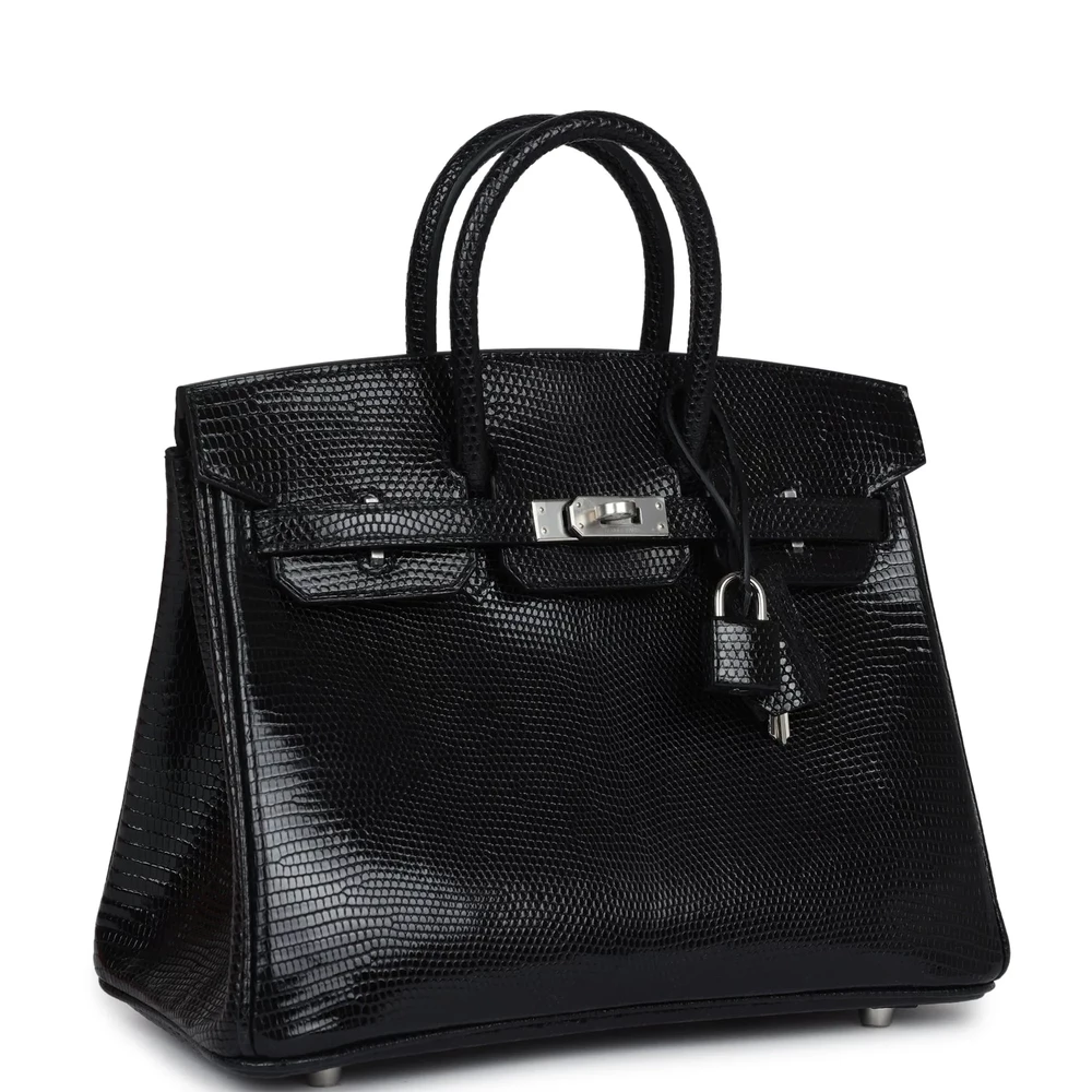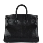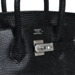 This Hermès Birkin 25 Black Shiny Varanus replica embodies monochrome mastery with its obsidian lizard scales, softened by palladium hardware. Sellier stitching traces the architectural lines, while hand-hammered feet protect the base. A high-end Hermès-inspired icon for purists, it merges reptilian texture with industrial minimalism. The glossy hide repels abrasions, paired with Hermès’ proprietary edge paint. A phantom’s muse for urban jungles or moonlit galas.