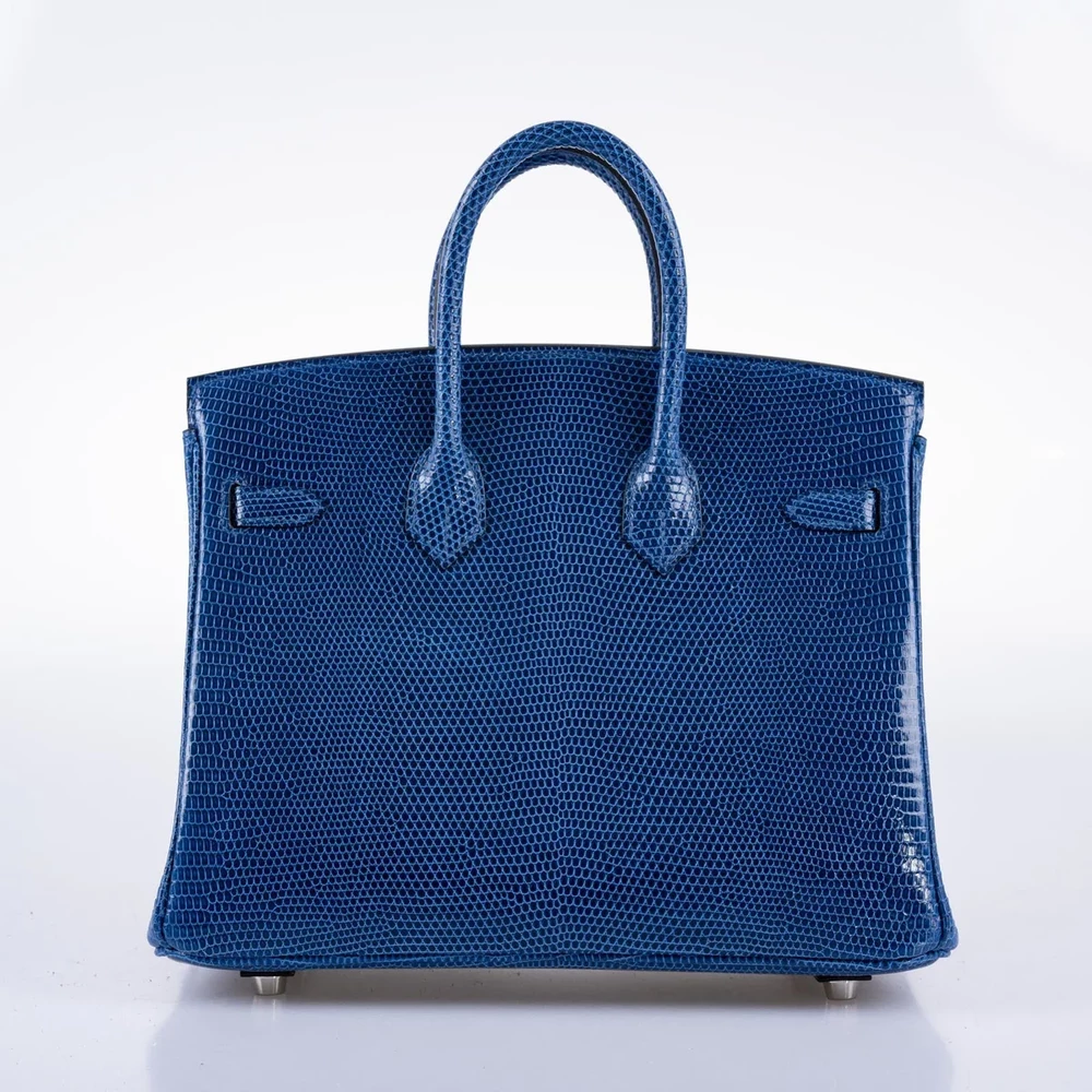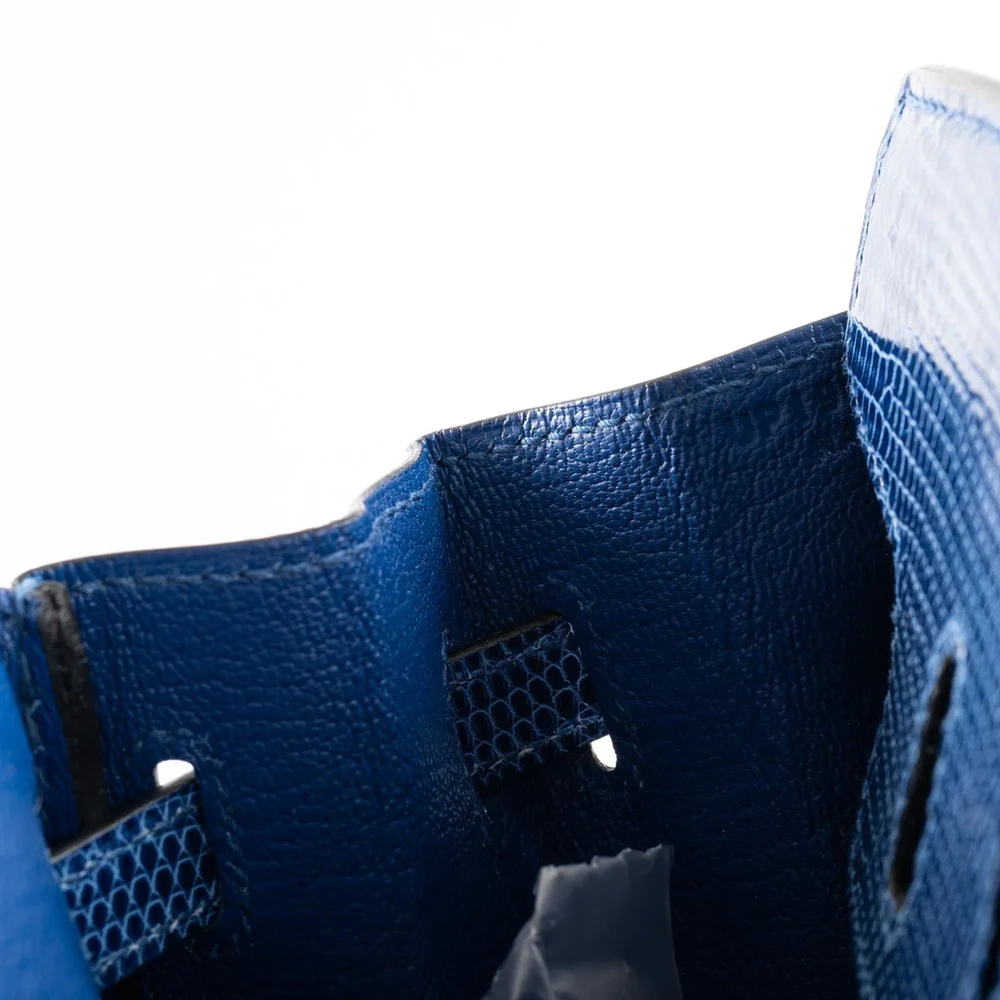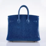 This Hermès Birkin 25 replica features rare Blue Sapphire Niloticus lizard leather with extraordinary scale definition. The deep aquatic hue shifts beautifully under light, enhanced by cool palladium hardware accents. Expert craftsmen have replicated every authentic detail from the tensioned sangles straps to the precisely angled corners. The interior boasts Hermès-grade organization with chevre leather lining and discreet pockets. A true luxury-inspired handbag that captures the maison’s exotic leather mastery in a practical everyday size. The structured silhouette maintains perfect proportions while allowing the supple lizard skin natural movement.