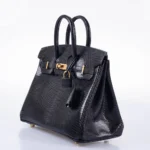 This Hermès Birkin 25 Black Niloticus Lizard replica commands attention with its glossy, diamond-patterned leather, polished to a liquid sheen. Gold hardware amplifies the structured silhouette, while hand-hammered sangles evoke artisanal rigor. A pinnacle of mirror-quality craftsmanship, it caters to collectors of luxury replica handbags. The Niloticus hide retains its shape with military precision, accented by flawlessly aligned pipping. Equally at home in jet-set lounges or urban jungles, it epitomizes audacious refinement.